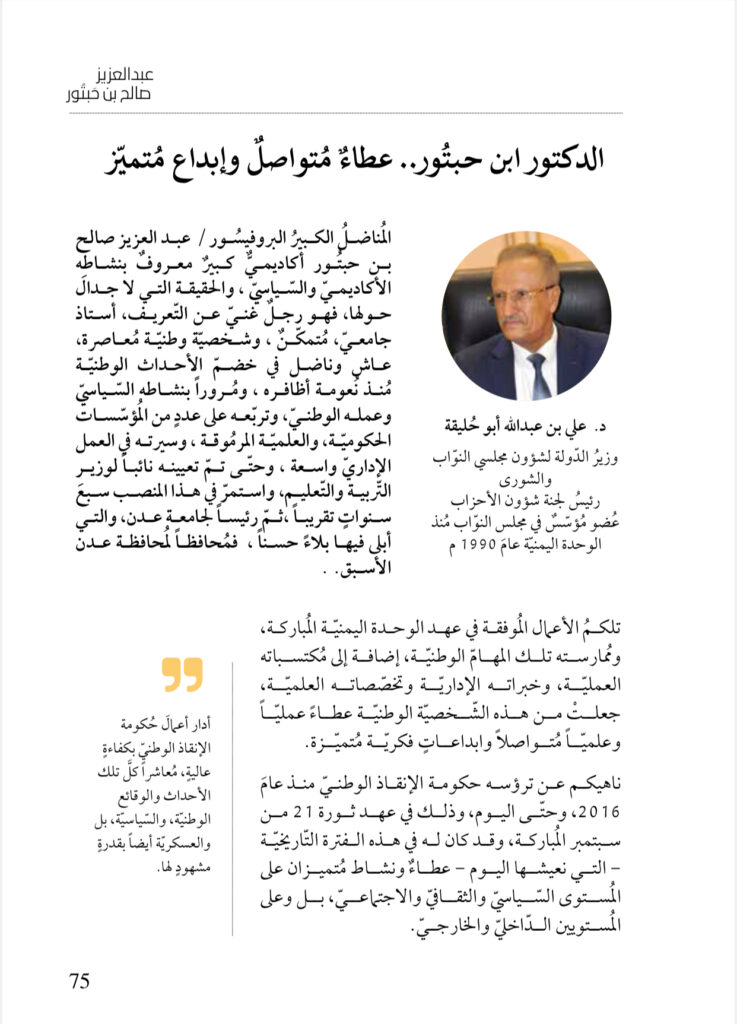 المُناضلُ الكبيرُ البروفيسُور / عبد العزيز صالح بن حبتور أكاديميٌّ كبيرٌ معروفٌ بنشاطه الأكاديميّ والسّياسِيّ ، والحقيقة التي لا جدالَ حولها، فهو رجلٌ غنيّ عن التّعريف، أستاذ جامعيّ، مُتمكّنٌ ، وشخصيّة وطنيّة مُعاصرة، عاشٍ وناضل في خضمّ الأحداث الوطنيّة مُنذ نُعومة أظافره ، ومُروراً بنشاطه السّياسيّ وعمله الوطنيّ، وتربّعه على عددٍ من المؤسّسات الحكوميّة، والعلميّة المرمُوقة ، وسيرته في العمل الإداريّ واسعة ، وحتى تمّ تعيينه نائبا لوزير التّربية والتّعليم، واستمرّ في هذا المنصب سبعَ سنواتٍ تقريبا ، ثمّ رئيسا لجامعة عدن، والتي أبلى فيها بلاءً حسناً ، فمُحافظاً لمحافظة عدن الأسبق.