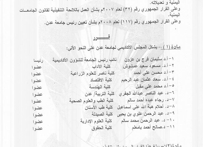 قرار رئيس جامعة عدن بشأن تشكيل مجلس أكاديمي جامعة عدن