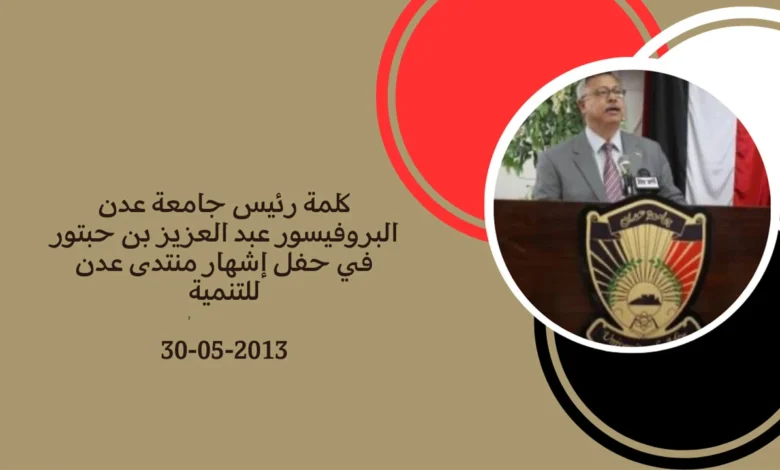 كلمة رئيس جامعة عدن البروفيسور عبد العزيز صالح بن حبتور في حفل إشهار منتدى عدن للتنمية 30-05-2013